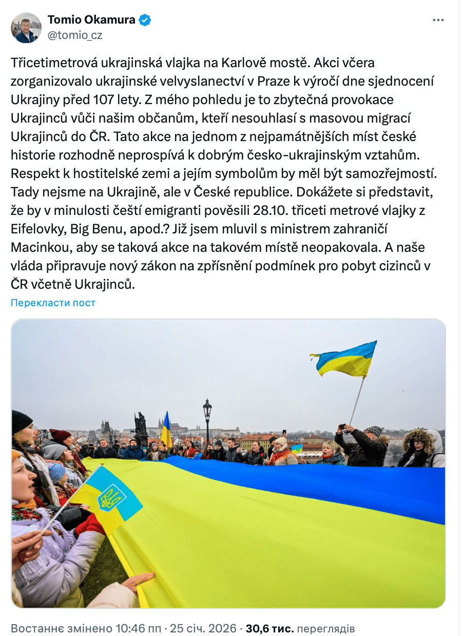 Спікер парламенту Чехії Томіо Окамура назвав розгортання 30-метрового прапора України в центрі Праги 24 січня з нагоди Дня Соборності провокацією. Політик вважає, що такі акції шкодять відносинам між народами.