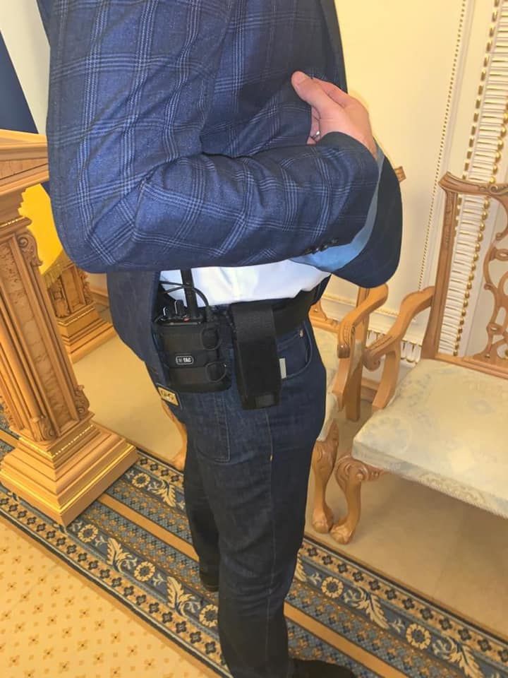 "Окремі користувачі соціальних мереж зробили припущення, що сьогодні у Верховній Раді України під піджаком військовослужбовця Управління державної охорони була прихована вогнепальна зброя. Насправді до його паска прикріплені радіостанція та передбачений внутрішніми інструкціями турнікет, призначений для надання першої домедичної допомоги", - пояснили в УДО.