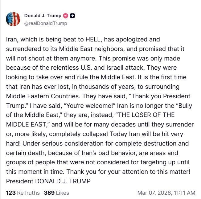 Окрім того, очільник Білого дому заявив, що президент Ірану Масуд Пезешкіан перепросив перед сусідніми близькосхідними країнами лише «через невпинні атаки США» і тому, що «зазнає супер поразок».