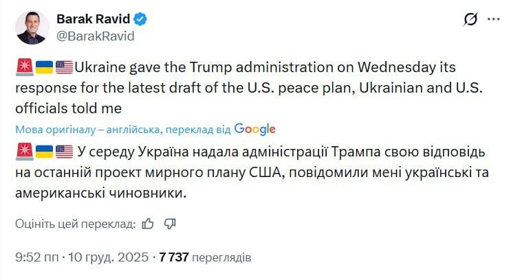 Україна передала свою відповідь адміністрації президента Сполучених Штатів Америки Дональда Трампа щодо останнього проєкту мирного плану.