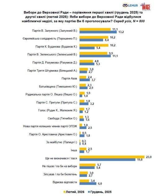 Як свідчать дані опитування збільшилась підтримка умовної партії Кирила Буданова – на 4,8% порівняно з груднем 2025 року та Європейської солідарність — на 1,8%. В той же час підтримка українців падає до таких політичних проектів: партія Залужного -2,1%, партія Зеленського -1,2%, партія Разумкова -0,5%.
