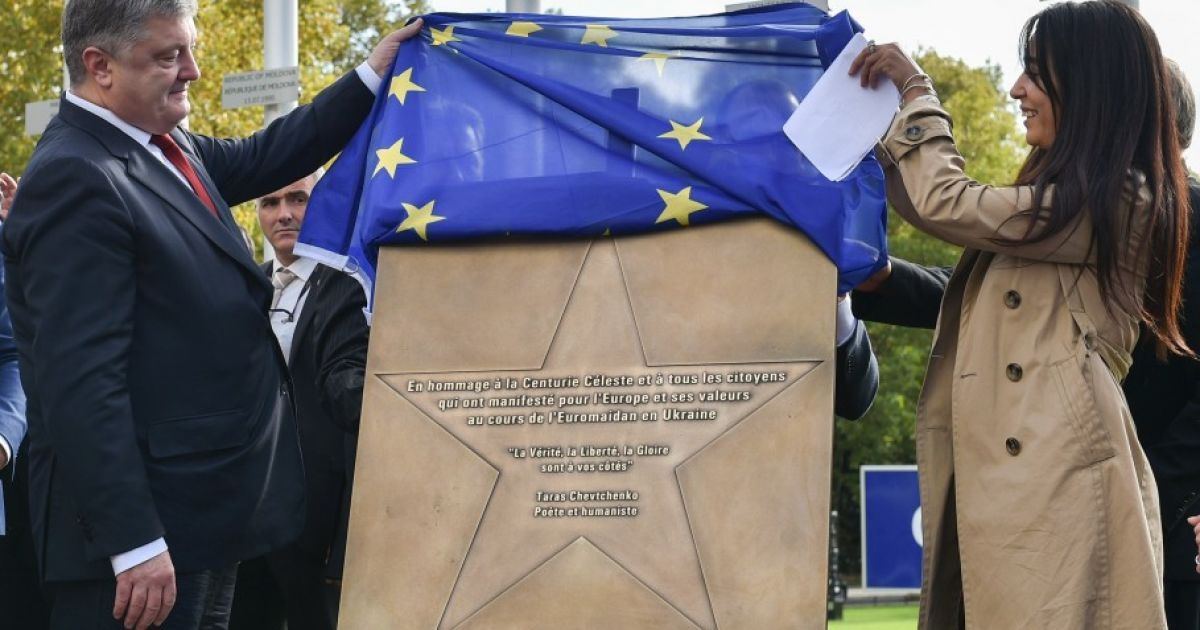 Президент України Петро Порошенко взяв участь у відкритті пам’ятної «Зірки Небесної Сотні» в Страсбурзі біля будівлі Ради Європи.