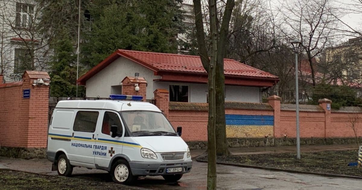 Біля будівлі стоять кілька поліцейських авто та представники підрозділу з охорони дипломатичних установ.