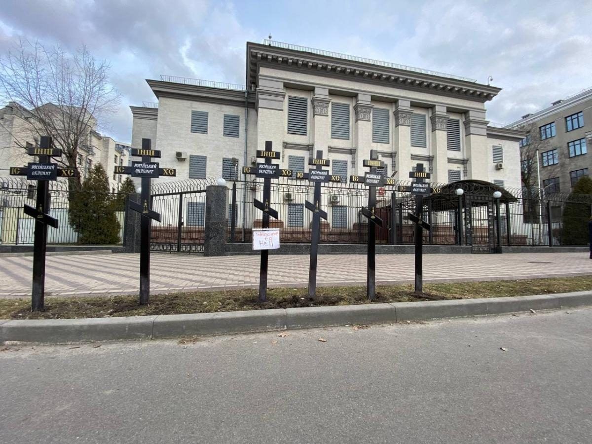 Водночас перед центральним входом до будівлі посольства досі знаходиться встановлена напередодні активістами інсталяція у вигляді кількох могильних хрестів з табличками "російський окупант" та написом англійською мовою "ласкаво просимо до пекла".