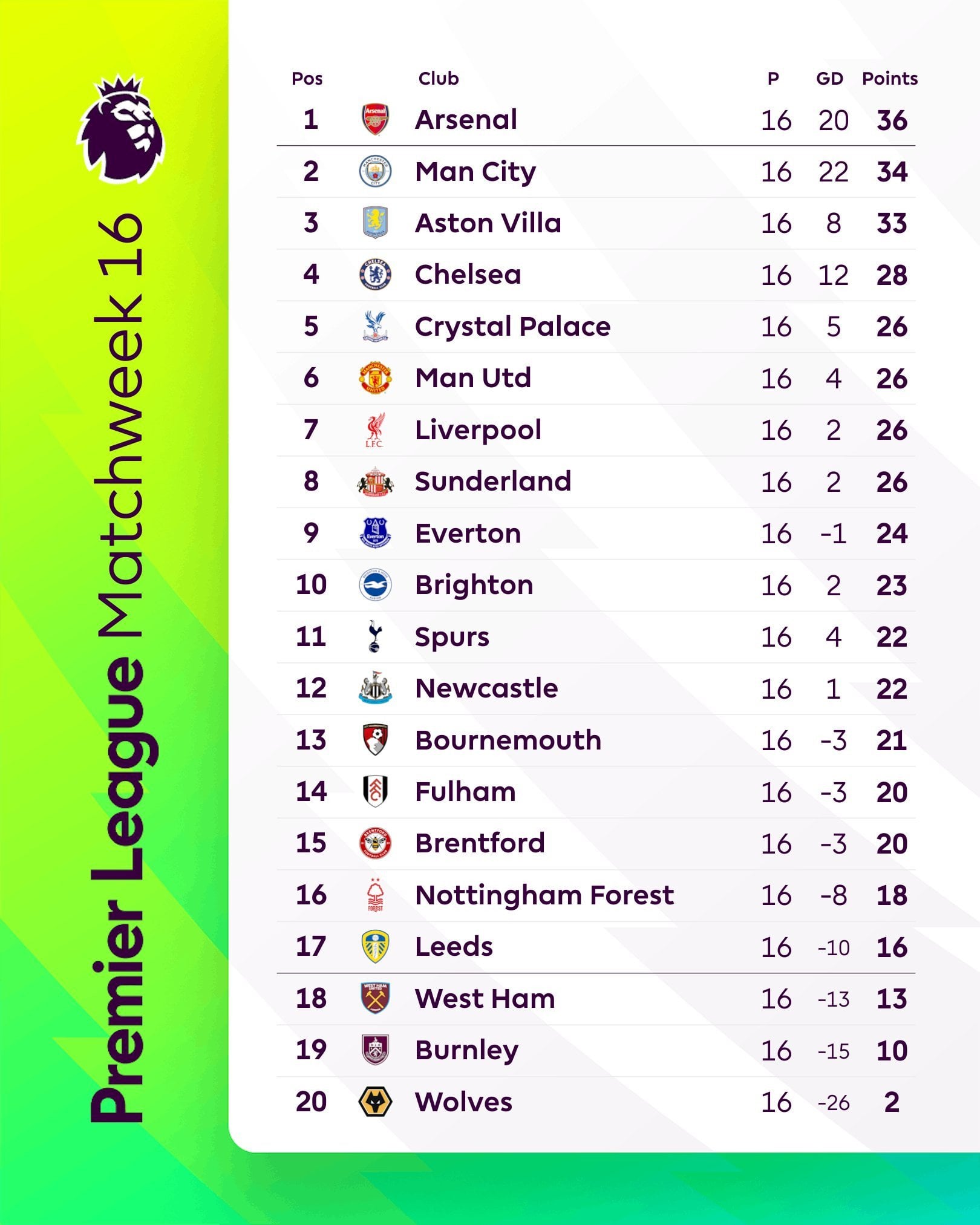 Таблиця АПЛ після 16-го туру / x.com/premierleague