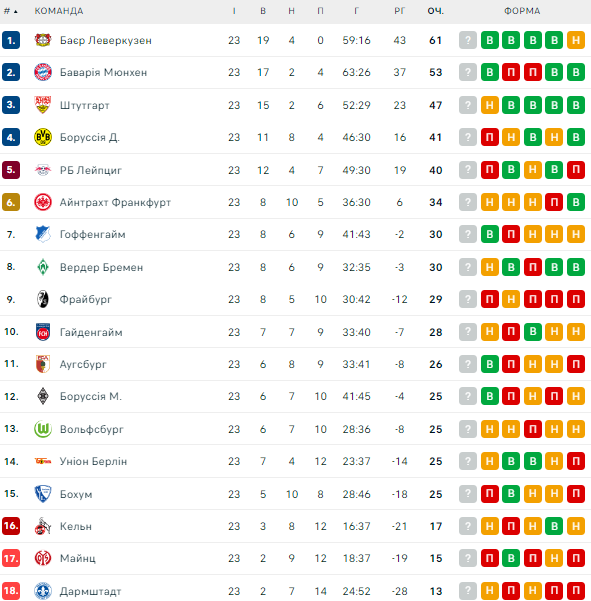 Після 23-го туру таблицю Бундесліги очолює "Баєр" (61 очко). На другому місці – "Баварія" (53). Далі йдуть "Штутгарт" (47), "Боруссія" Дортмунд (41) і "РБ Лейпциг" (40).