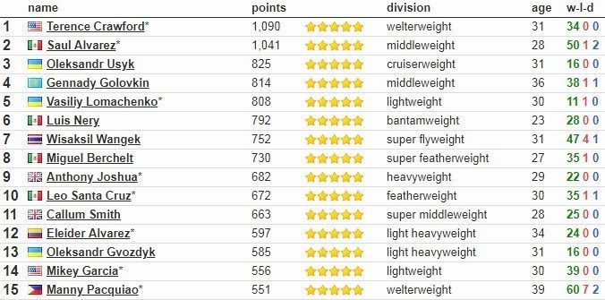 Зазначимо, що в цьому рейтингу також присутні й інші українці - абсолютний чемпіон у важкій вазі Олександр Усик (3 місце) та чемпіон світу за версією WBA у легкій вазі - Василь Ломаченко (5 позиція).