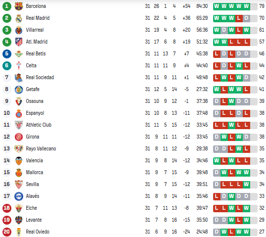 Таблиця Ла Ліги після 31-го туру / sofascore.com