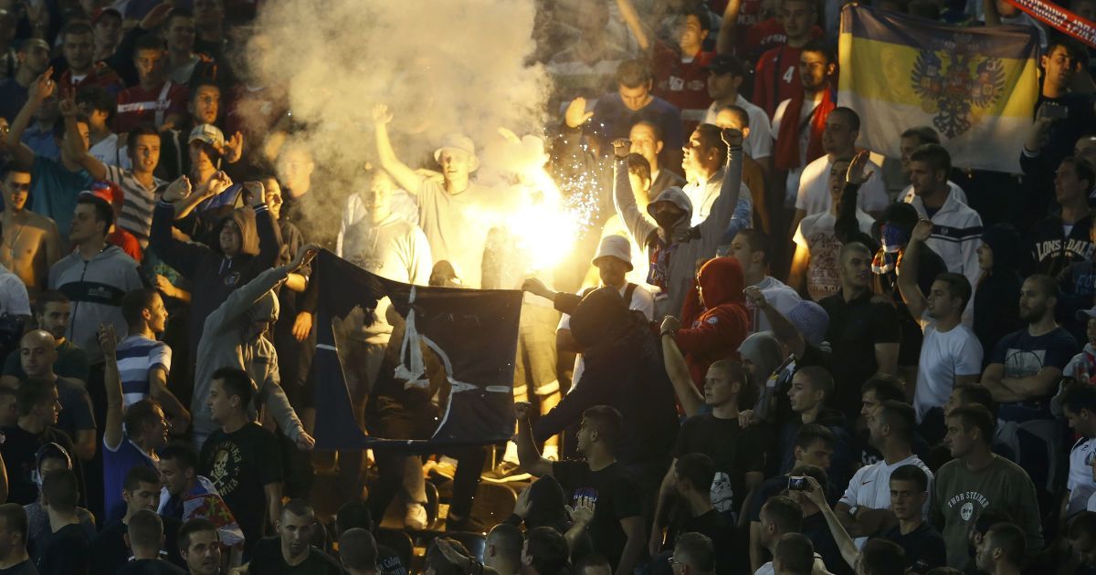 На трибунах почалися безлади: сербські фанати палили фаєри та жбурляли їх на поле. Також вони спалили прапор НАТО.