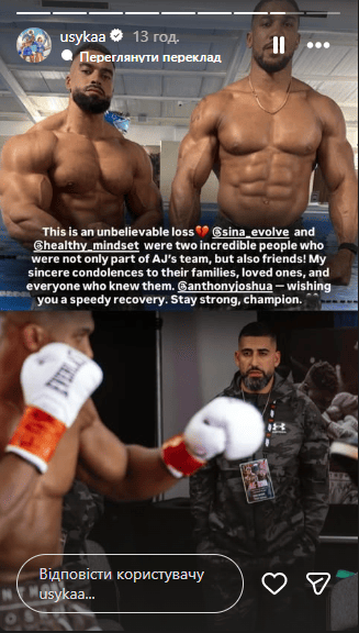 Український боксер у себе в Instagram-сторіз підтримав британця, а також висловив співчуття рідним і близьким двох його тренерів, які загинули в аварії.