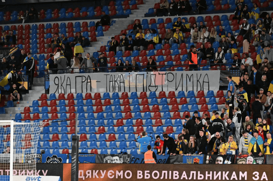 На трибунах стадіону "Сьютат де Валенсія" в іспанському місті Валенсія фанати розмістили банер із написом українською мовою: "Яка гра — така і підтримка".