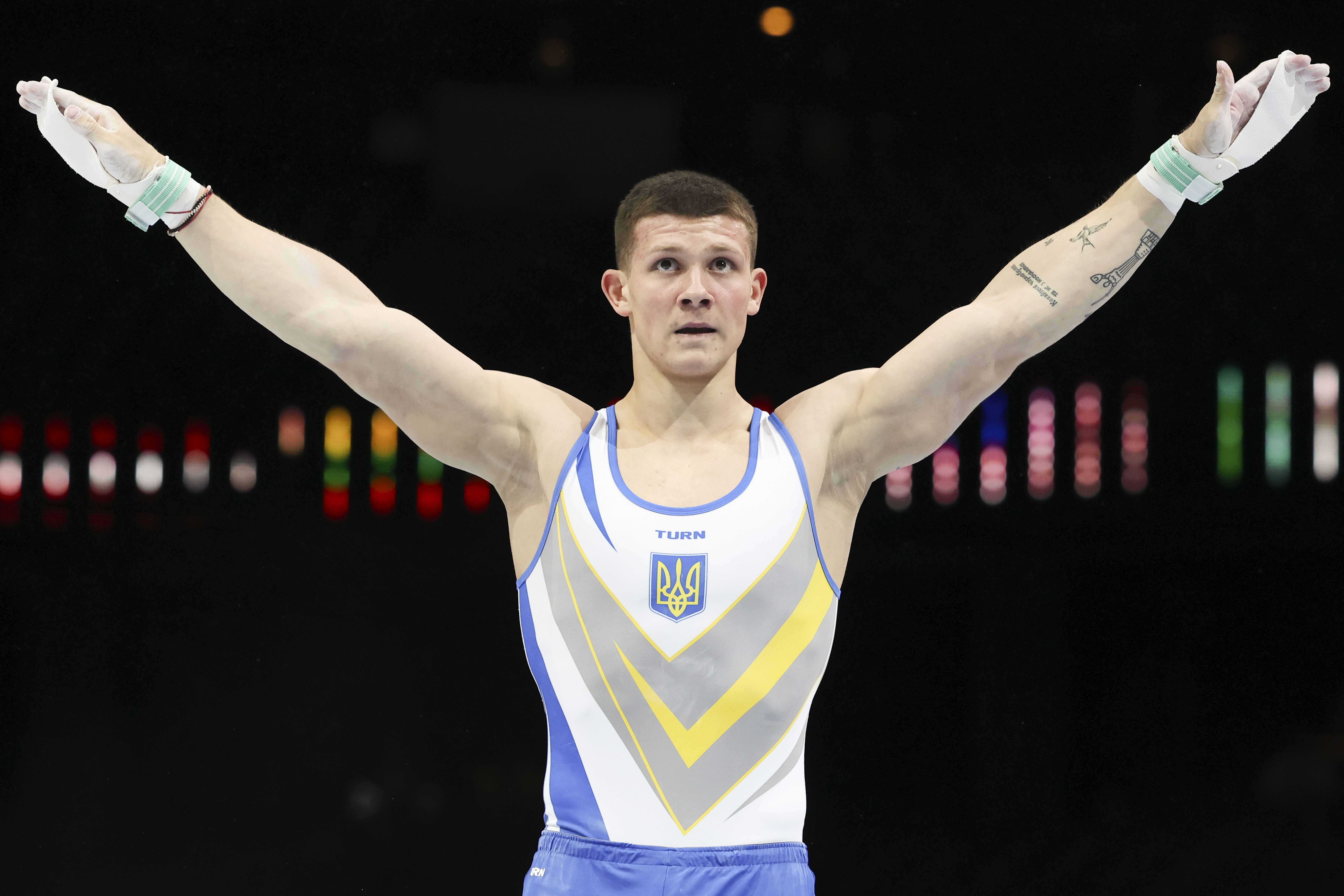 На руках гімнаста можна побачити монумент "Батьківщина-Мати", лелеку, напис "Home" ("Дім"), де замість літери "o" намальовано мапу України. Також є соняшник, тризуб у вигляді слова "Воля", цитата з поеми "Катерина" Тараса Шевченка: "Кохайтеся, чорнобриві, та не з москалями".