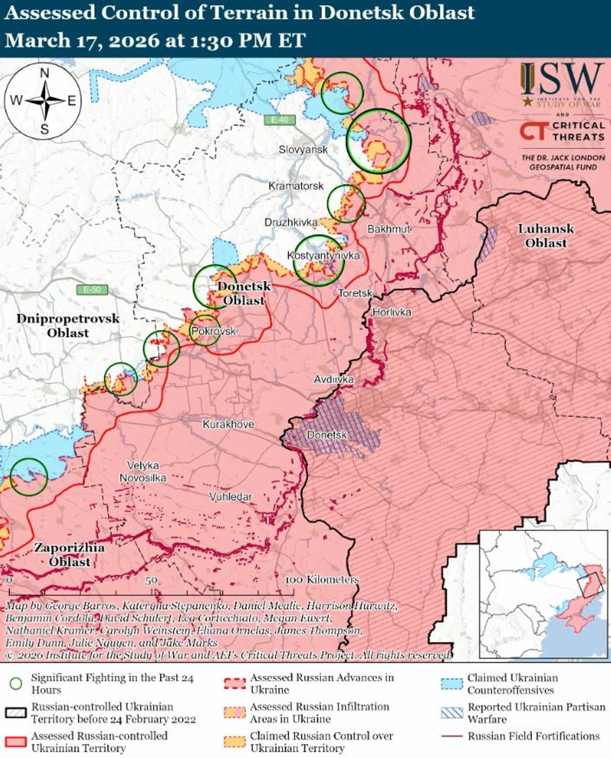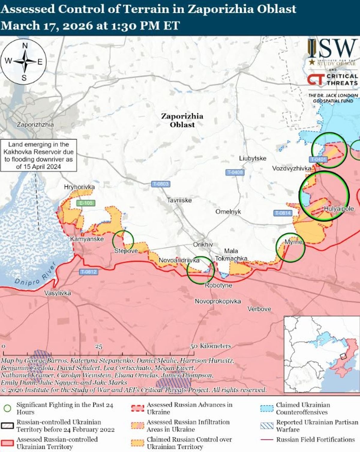 В то же время, по данным ISW, геолокационные кадры за 17 марта свидетельствуют, что украинские войска имели тактическое продвижение в центральной части Новоданиловки (южнее Орехова). Однако фиксируется и незначительное продвижение российских войск к югу от населенного пункта Зализнычное (западнее Гуляйполя).