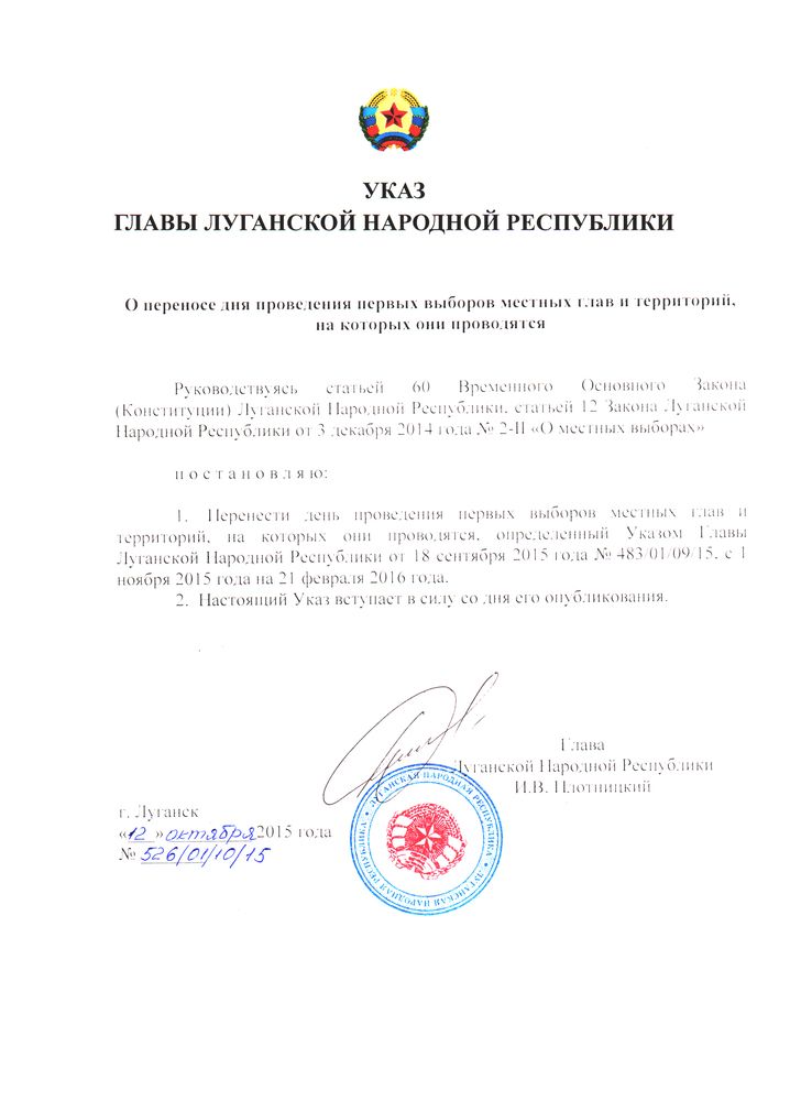 "Перенести день проведения первых выборов местных глав и территорий, на которых они проводятся, ... с 1 ноября 2015 на 21 февраля 2016 года", - говорится в указе главаря боевиков.