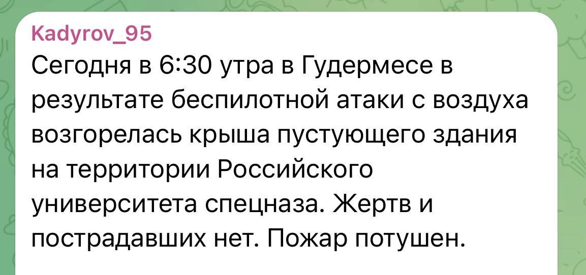 "Сегодня в 6:30 утра в Гудермесе в результате беспилотной атаки с воздуха вспыхнула крыша пустого здания на территории Российского университета спецназа. Жертв и пострадавших нет. Пожар потушен", — заявил Кадыров.