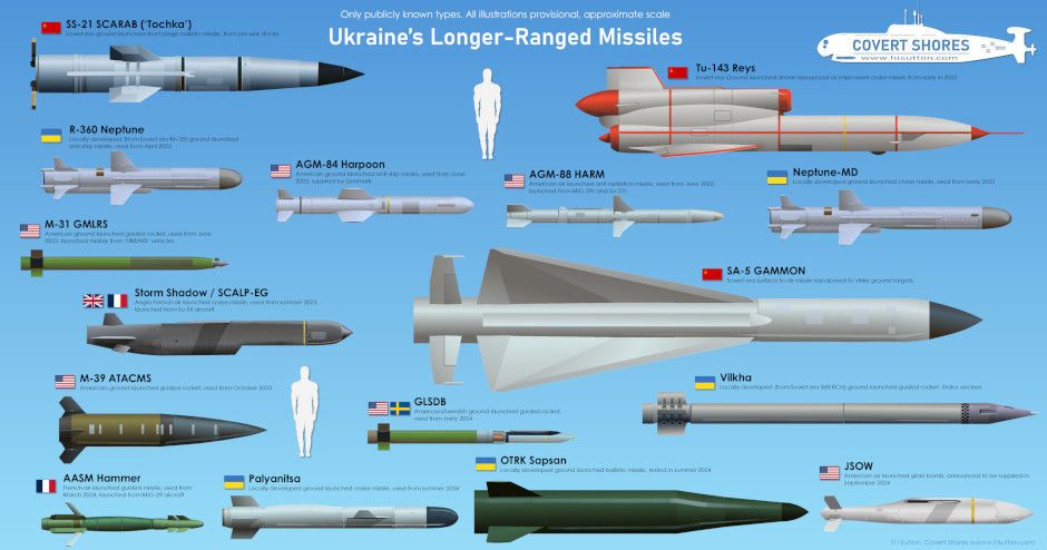 Известный западный OSINT-исследователь HI Sutton подготовил иллюстрацию с линейкой дальнобойных ракет Украины, способных поражать наземные цели.