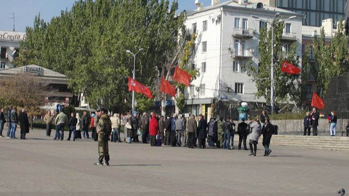 "На площади Ленина в Донецке проходит очередной митинг организации "Коммунистическая партия ДНР" на поддержку руководства группировки "ДНР" и "донецкого народа", которому, как сказал выступающий - "150 лет", - информирует журналист.