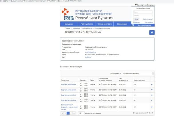 На сайте службы занятости отмечено, что претенденты могут звонить начальнику части Юрию Медведеву.