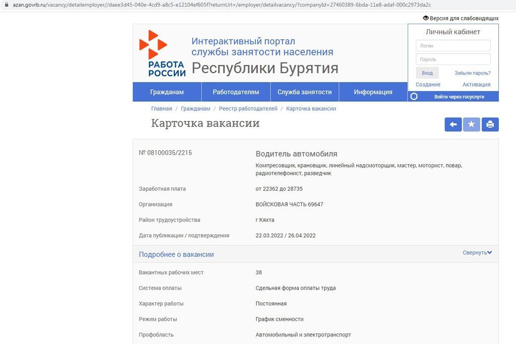 Военная часть №69647, дислоцирующаяся в бурятском городе Кяхта, опубликовала объявление о поиске рядовых, сержантов и водителей.