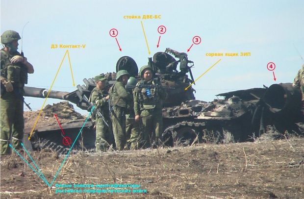 В материале говорится, что в фотоальбоме Панченко обнаружено фото, загруженное 22 октября 2014 года, на котором группа российских военнослужащих позирует на фоне сожженного танка Т-72БА.