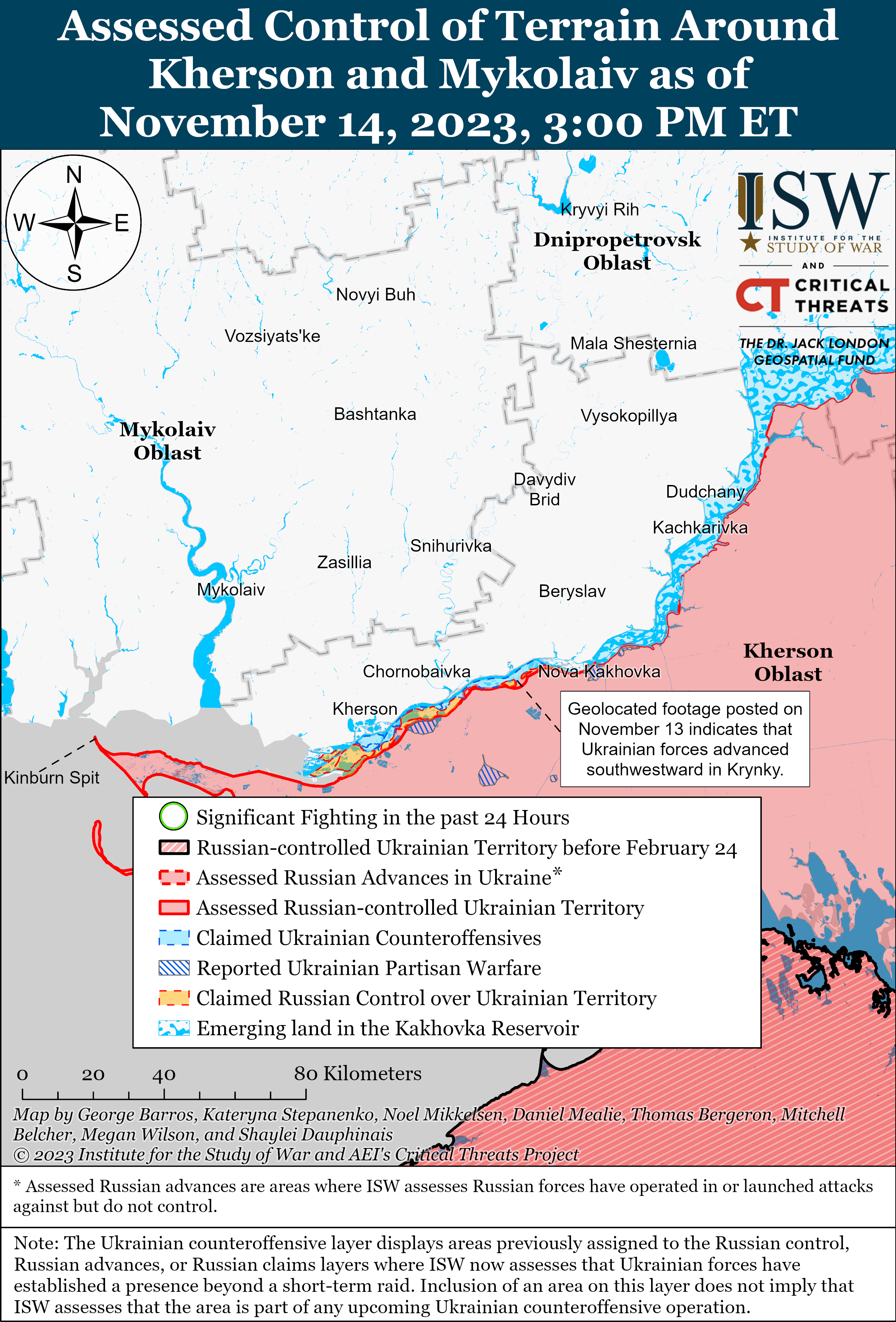 "Украинские силы проводят более масштабные, чем обычно, наземные операции на восточном берегу Херсонской области с середины октября 2023 года и что украинские силы, похоже, способны удерживать и обеспечивать свои текущие позиции на контролируемой Россией стороне Херсонской области", — отметили аналитики.