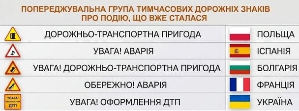 В Украине европейский вариант знака с интуитивно понятным значком опрокинутого автомобиля не используется. Вместо этого отечественные патрульные и дорожные службы применяют квадратный информационный щит с текстовой надписью «Внимание! Оформление ДТП.