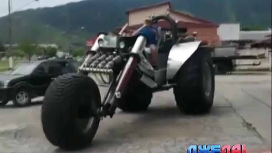 Чудо-машина построена на базе трактора. Однако вместо пары передних колес она имеет мотоциклетную вилку. Точнее - мотоциклетные вилы.