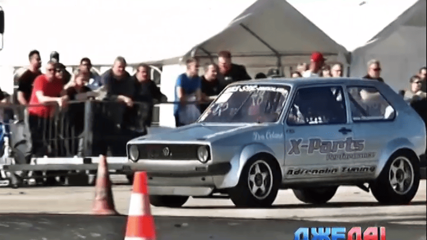 Двигатель на 1150 лошадей и полный привод имели превратить маленький Golf на пожирателя четверти мили. Однако нагрузка в тысячу ньютон-метров не выдержал кардан, который превратился в фигурно витую трубу. В конце концов, свой просчет механики устранили. И Golf промчался 402 метра за фантастические 8 секунд.