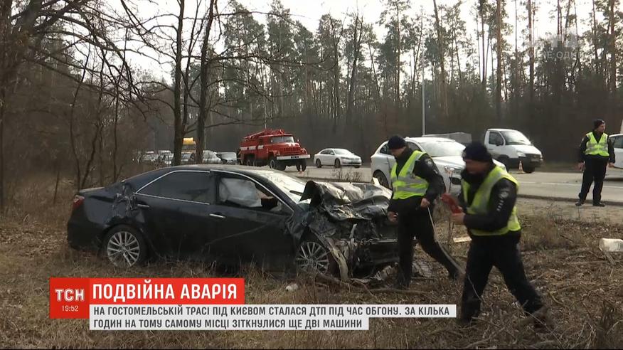 ДТП на Гостомельской трассе. Там произошло сразу две аварии. Утром лоб в лоб влетели две машины. А уже через несколько часов столкнулись другие, потому что не способны были объехать место оформления первого ДТП.