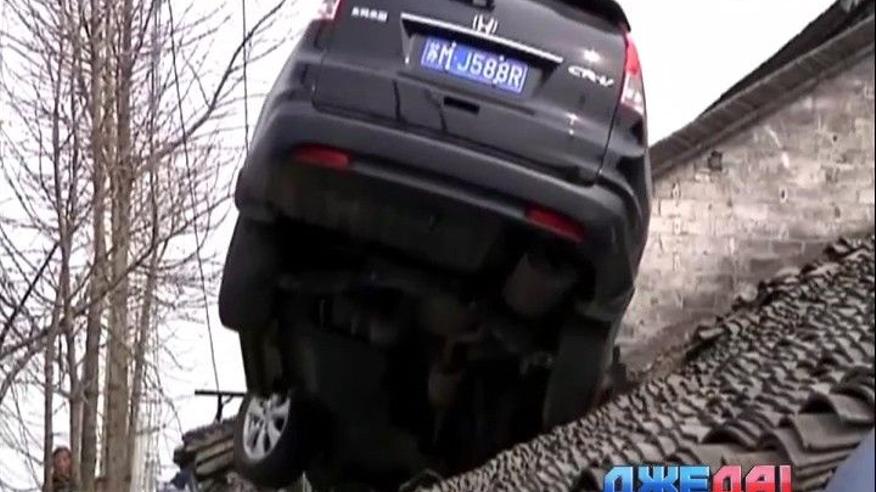 Автомобили в небе Китая. Несколько дней назад спасатели и местная полиция пытались снять машину, а вместе с ней и водителя с крыши дома. В городе Тайчжоу водитель Хонды потерял управление и вылетел с дороги. Закончился полет не в кювете, а на крыше одного из домов рядом с дорогой.