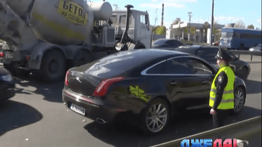 В результате столкновения посреди дороги разбросало Peugeot и грузовик. А вот и виновник многокилометрового затора, по словам свидетелей, водитель Jaguar с болгарскими номерами. Быстрый болгарин пытался проскочить между Peugeot и грузовиком, двигались по соседним полосам. В итоге - две разбитые машины и пробка на несколько километров.