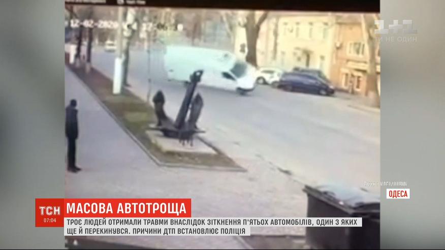 К вечеру в Одессе легковушка подрезала другую машину, отбросив ее на микроавтобус. Досталось и двум автомобилям на обочине. Момент столкновения - зафиксировали камеры наблюдения. У водителя автобуса - серьезные травмы. Кроме него, в госпитале - еще двое участников ДТП.