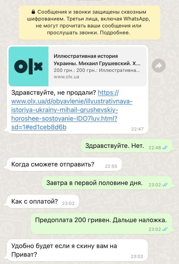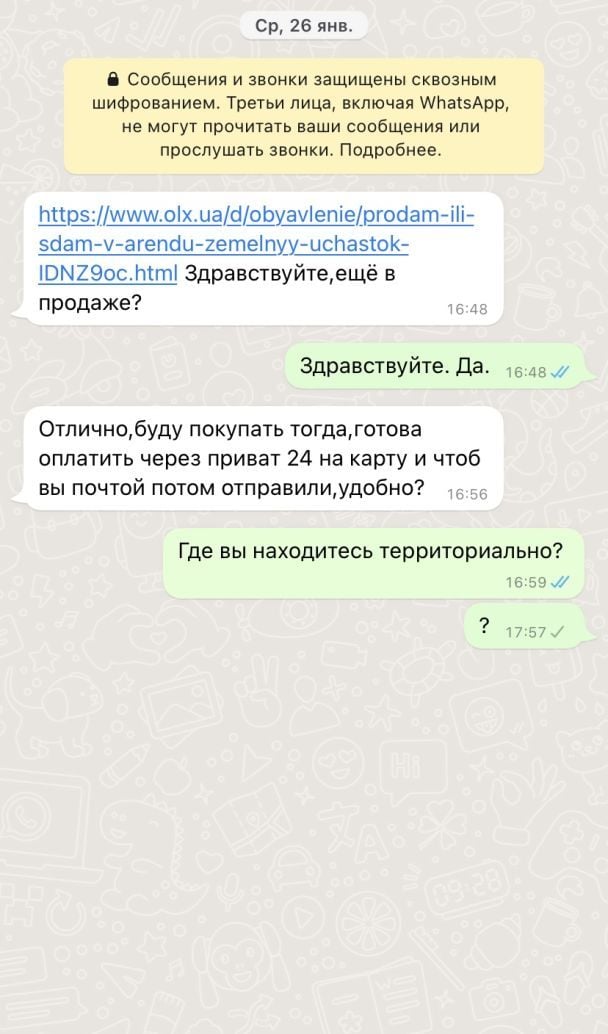 “Я опубликовала информацию о продаже земли. Через пять минут мне в WhatsApp пишет некая Ольга, которая, кстати, меня впоследствии заблокировала. В первом сообщении она задала вопрос, актуально ли еще мое объявление. А затем сразу написала, что “будет покупать, готова оплатить через "Приват24" на карту и чтобы документы я отправила им почтой”. Для справки: речь шла о нескольких сотнях тысяч долларов. И они хотели перечислить мне их на карту”, — рассказала ТСН.ua днепрянка Оксана Грищенко.