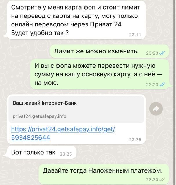 “Как у вас с оплатой? Будет удобно, если я скину на Приват? У меня карта ФОП и стоит лимит на перевод с карты на карту. Могу только онлайн-переводом через банк. Будет удобно?” — говорил мужчина.
