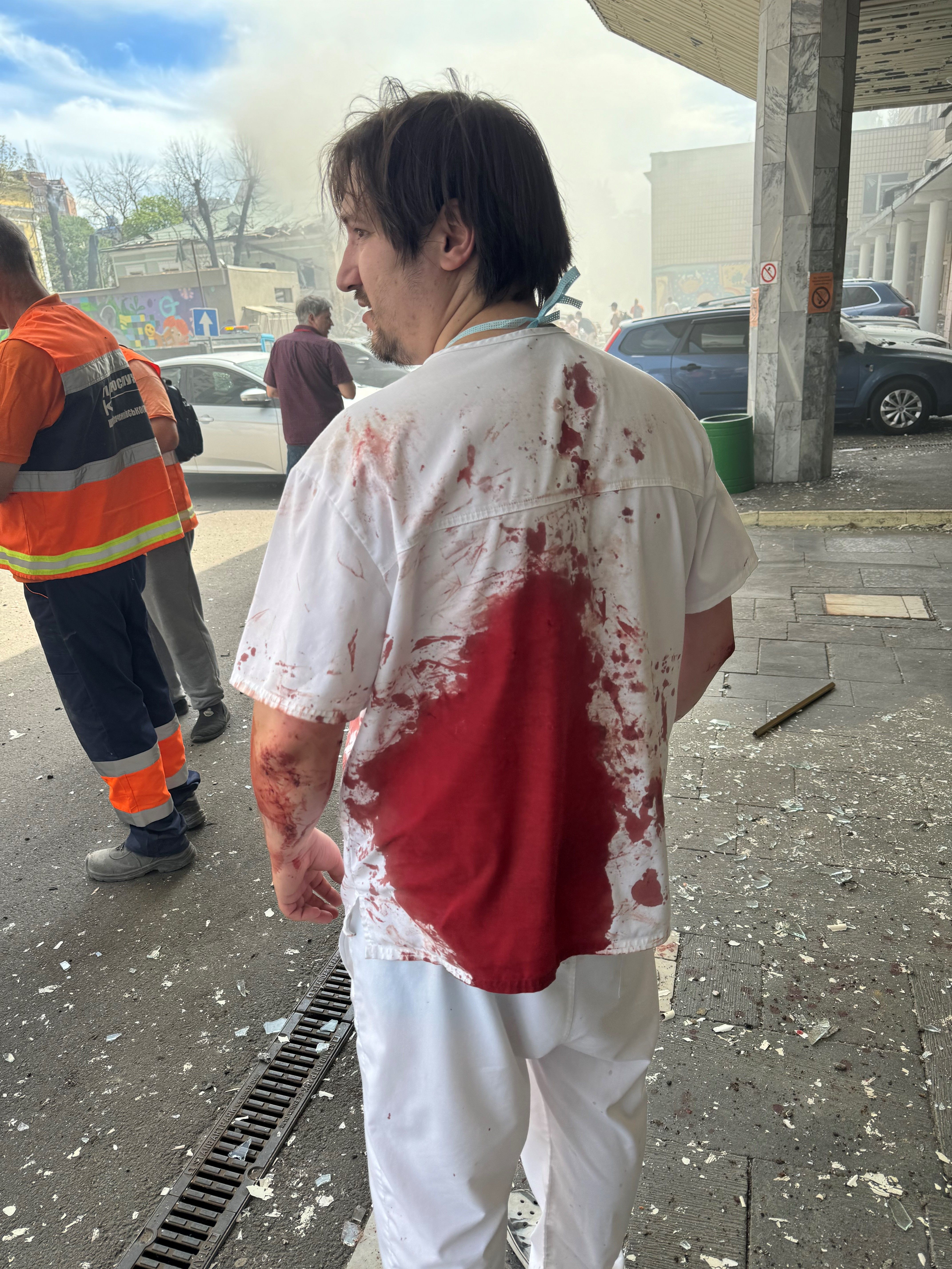 Олег Голубченко после обстрела детской больницы "Охматдет". Фото Олега Голубченко