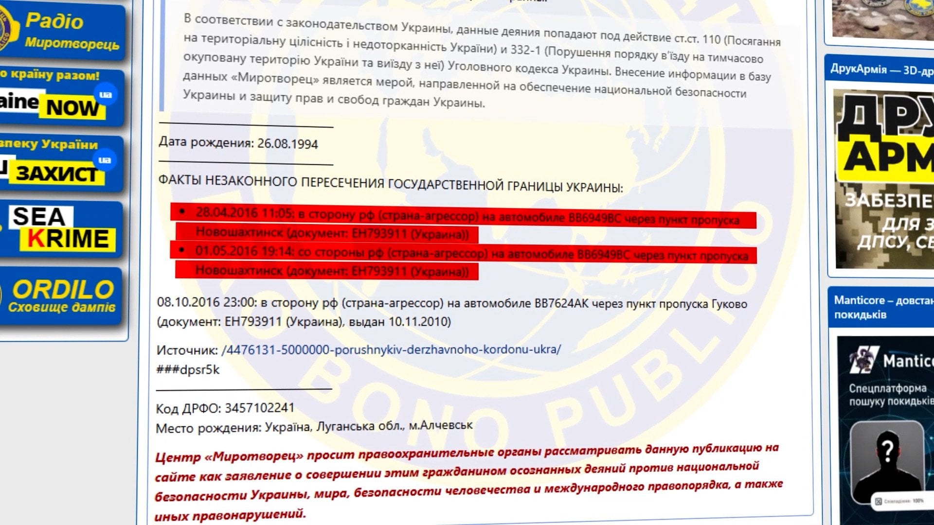 Скриншот из Миротворца