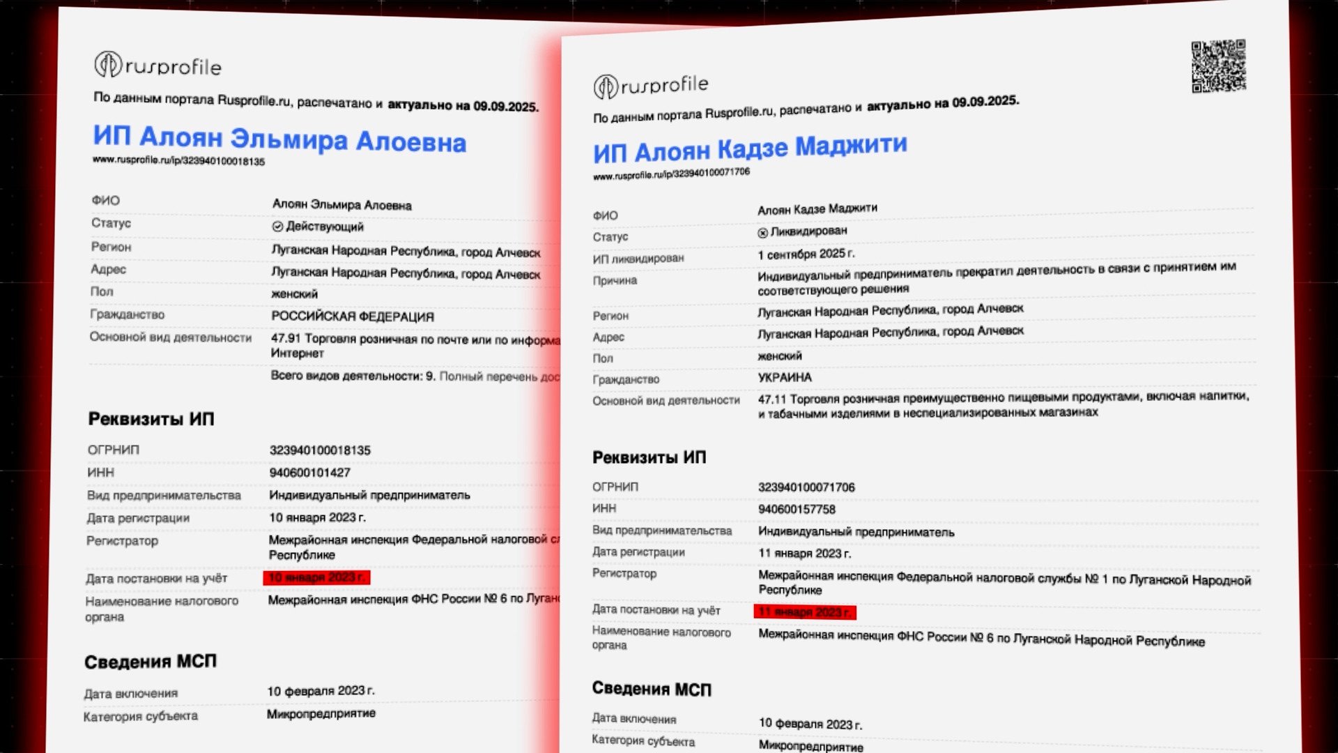Родные же дядя и тетя должностного лица Норайра и Элмира Алоян с 2023 года действующие предприниматели в так называемой ЛНР, и как указано в реестре — граждане Российской Федерации.