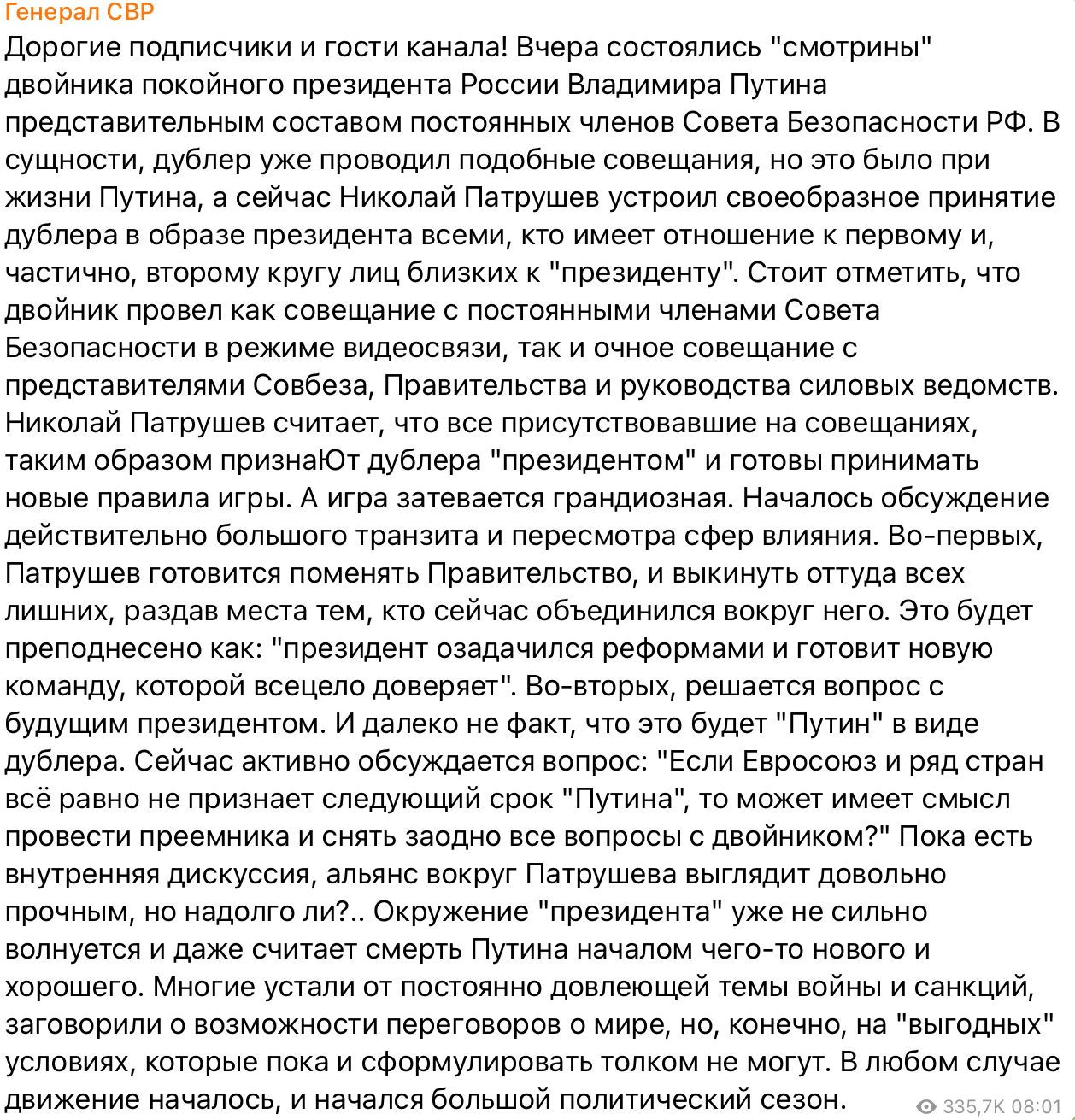 “Сейчас активно обсуждается вопрос: “Если Евросоюз и ряд стран все равно не признают следующий срок “Путина”, то может ли смысл провести преемника и снять при этом все вопросы с двойником?”. Пока есть внутренняя дискуссия, альянс вокруг Патрушева выглядит довольно прочным, но надолго ли?.. Окружение президента уже не сильно волнуется и даже считает смерть Путина началом чего-то нового и хорошего. Многие встали от постоянно довлеющей темы войны и санкций, заговорили о возможности переговоров о мире, но, конечно, на выгодных условиях, которые пока и сформулировать толком не могут. В любом случае, движение началось, и начался большой политический сезон”, — говорится в сообщении.