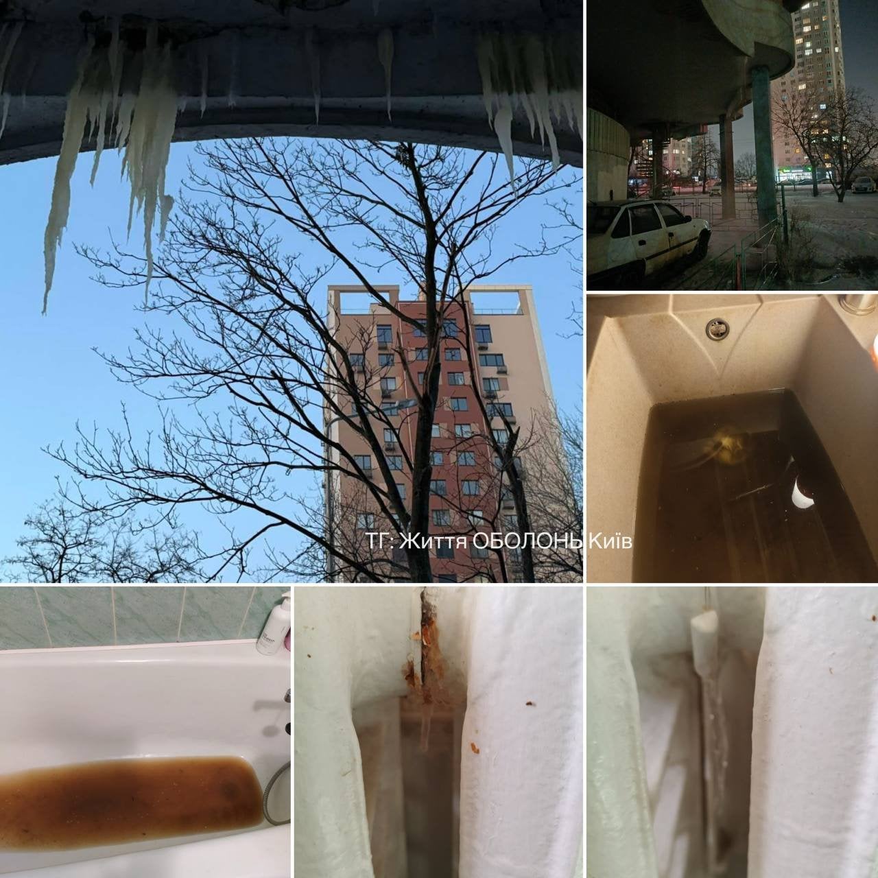 Так, на Оболонской площади система отопления замерзла, трубы лопаются, заливая щитовые. Люди вынуждены выносить нечистоты вручную, поскольку канализация также вышла из строя.