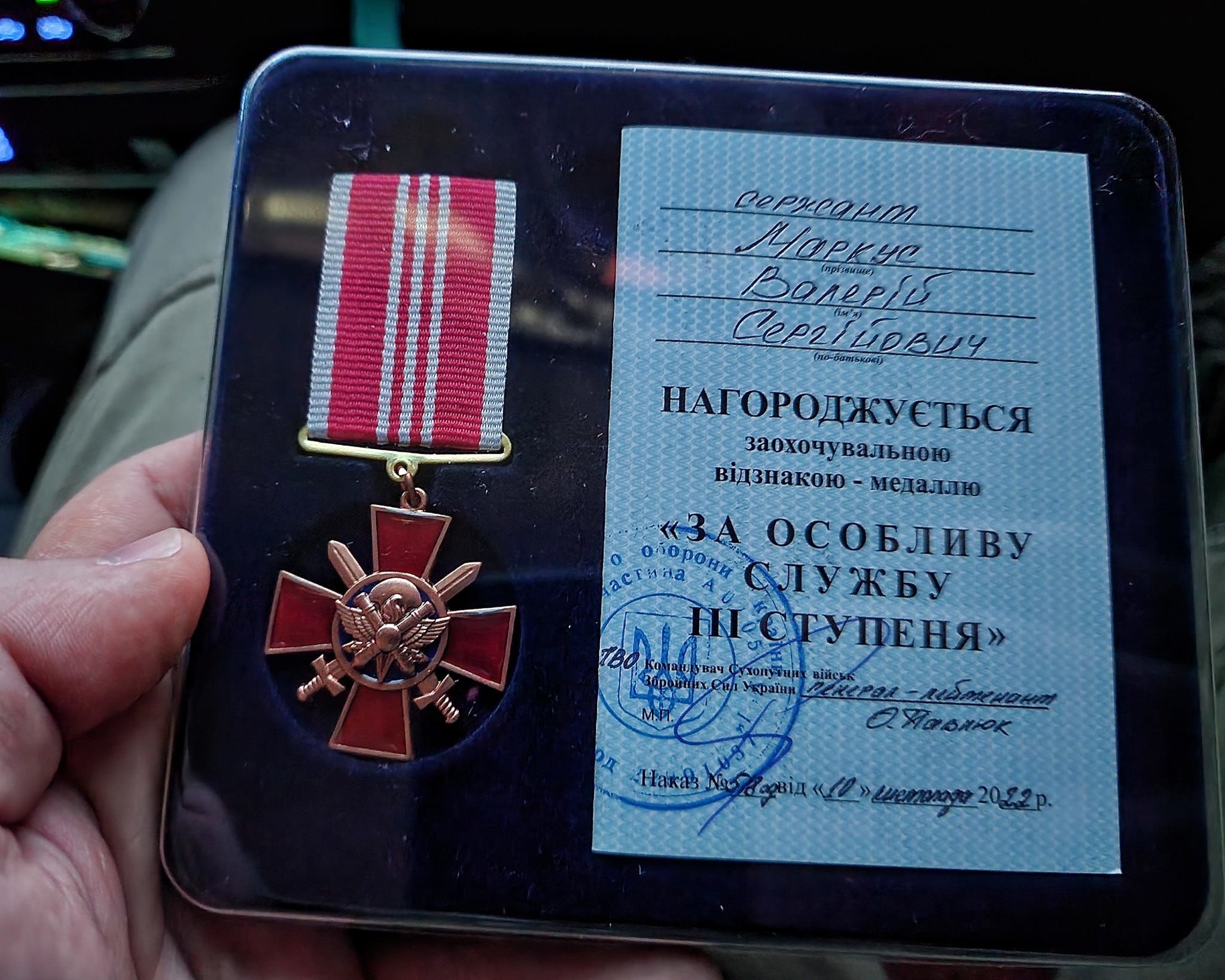 Поощрительное отличие от командующего Сухопутными войсками ВСУ / © Facebook страница Валерия Маркуса