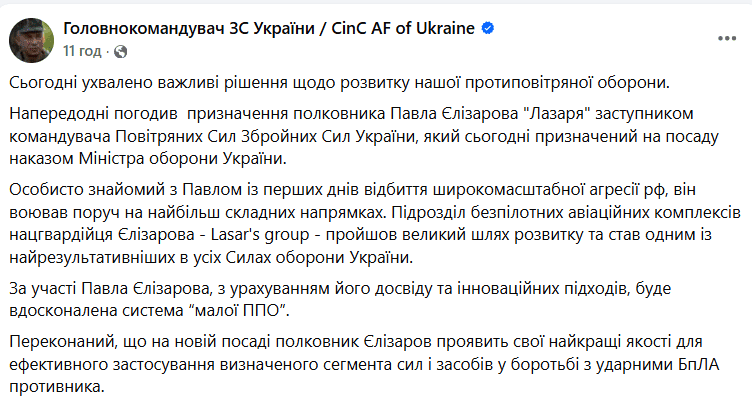 19 января президент Украины Владимир Зеленский объявил о назначении Павла Елизарова новым заместителем командующего Воздушными силами. Это решение напрямую связано с пересмотром подходов к защите украинского неба.