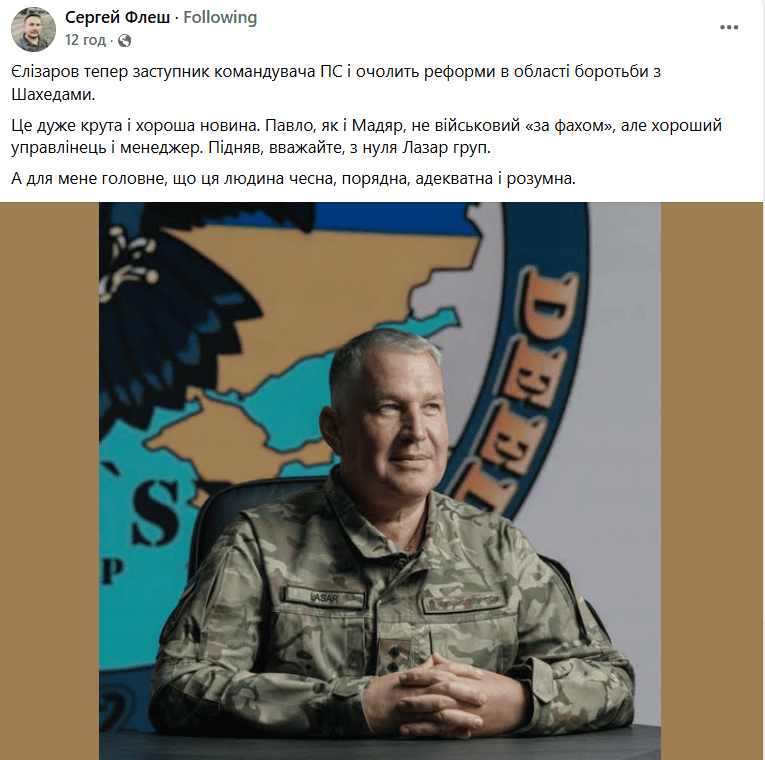 Украинский специалист и консультант в сфере военных радиотехнологий, известный под позывным «Флеш» называет кадровое решение по Павлу Елизарову «хорошей новостью». Он говорит, что Елизаров, как и «Мадьяр» — не является кадровым военным в классическом понимании, однако зарекомендовал себя как эффективный управленец и менеджер. Фактически с нуля он выстроил работу Lasar group, превратив подразделение в одно из самых результативных. «А для меня главное, что этот человек честный, порядочный, адекватный и умный», — добавляет «Флеш».