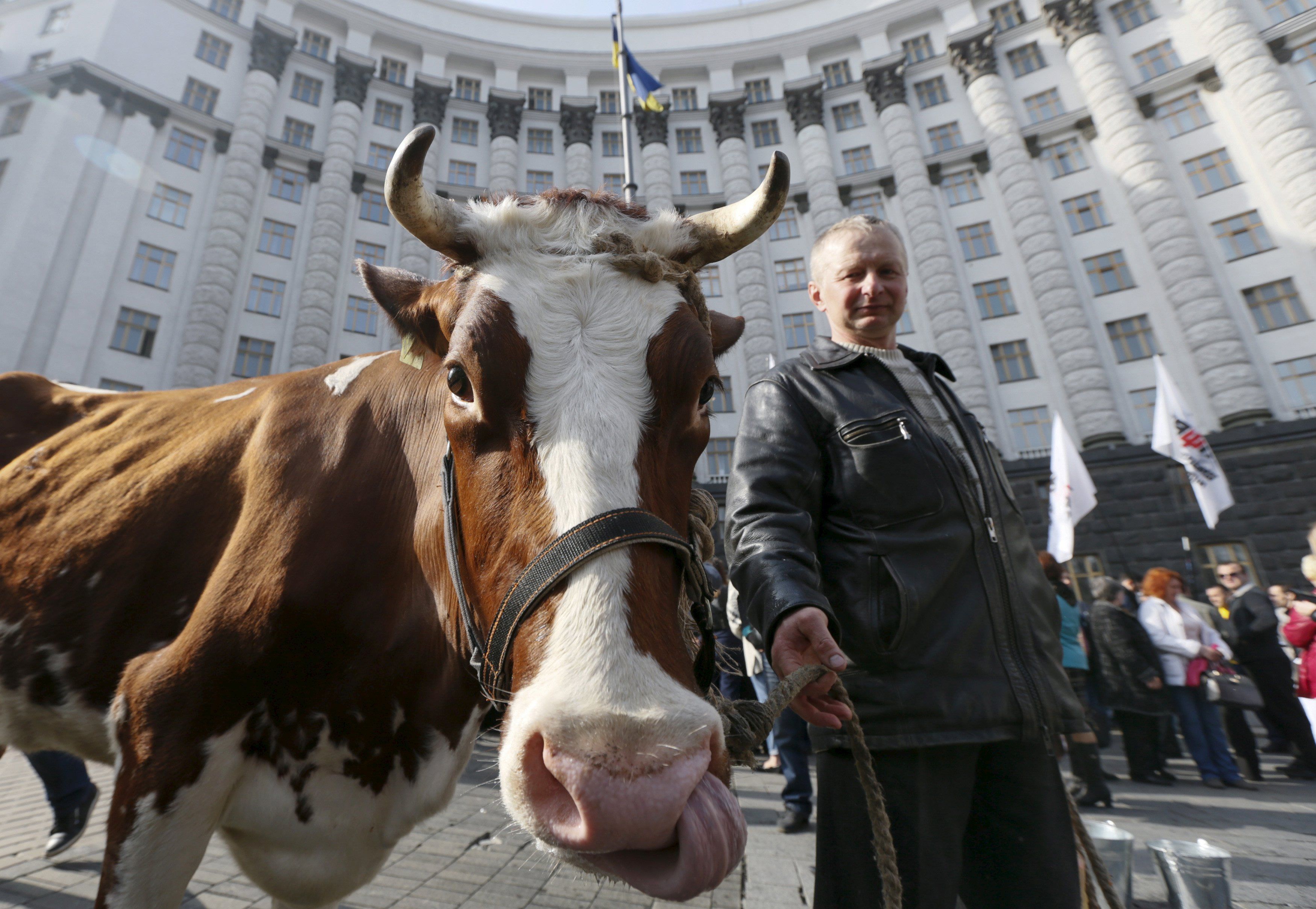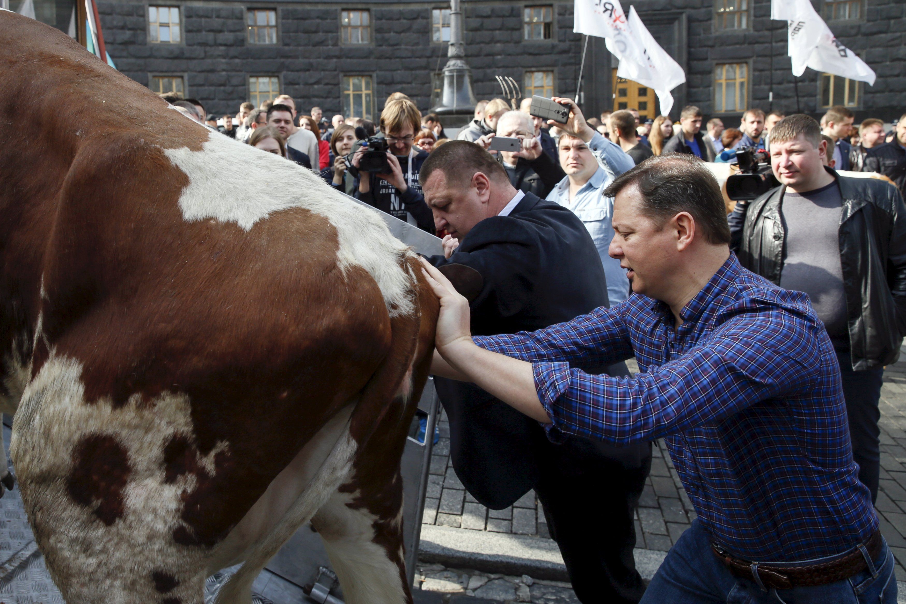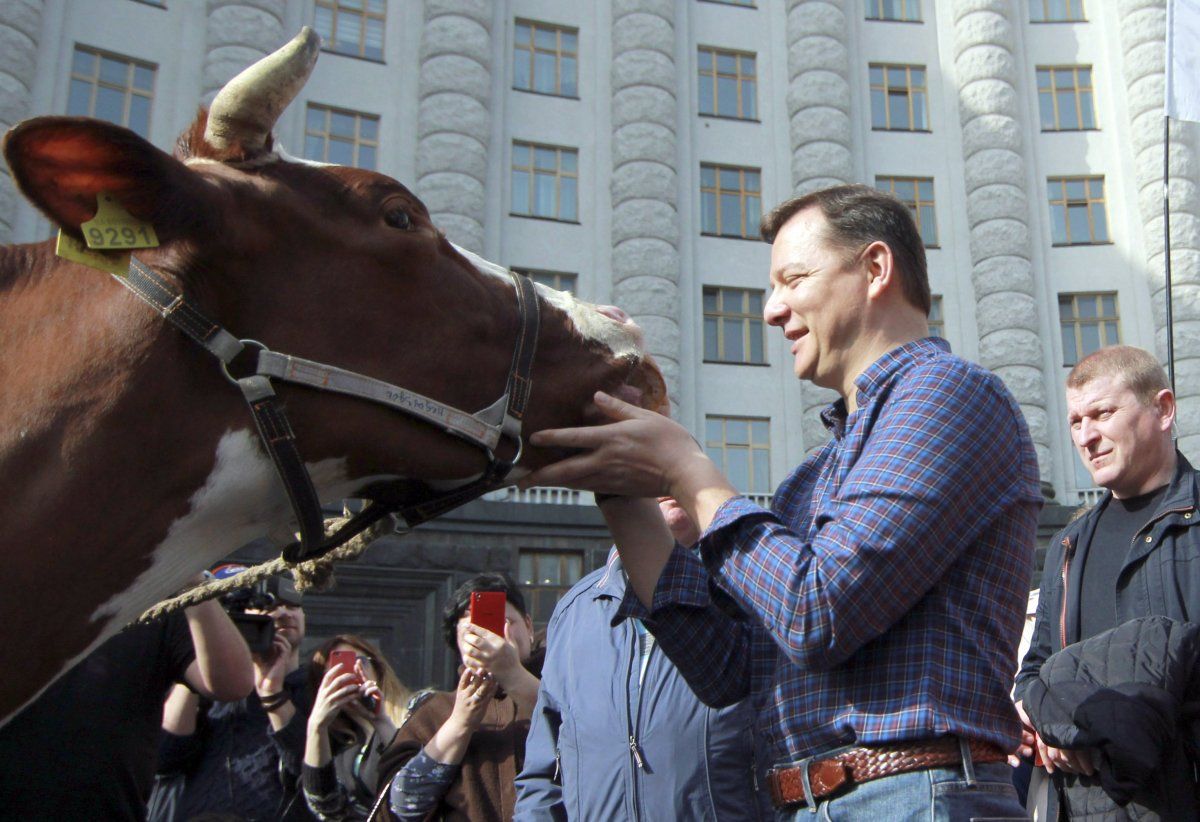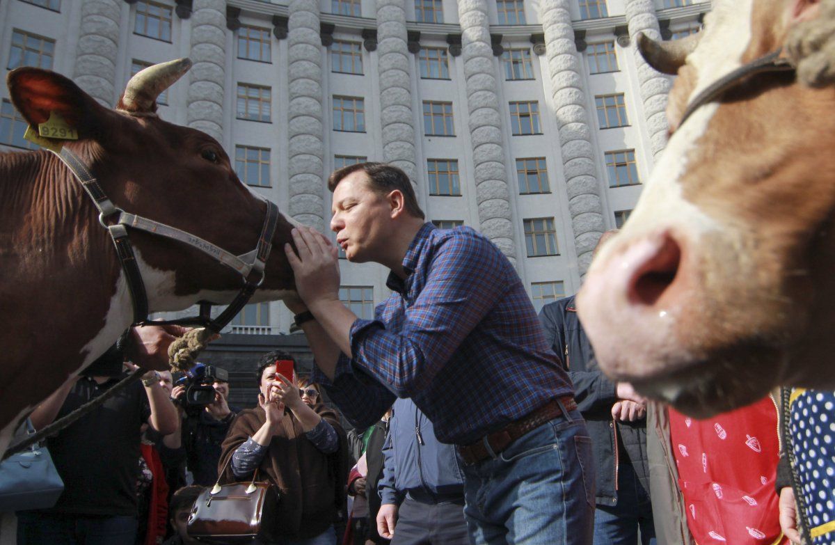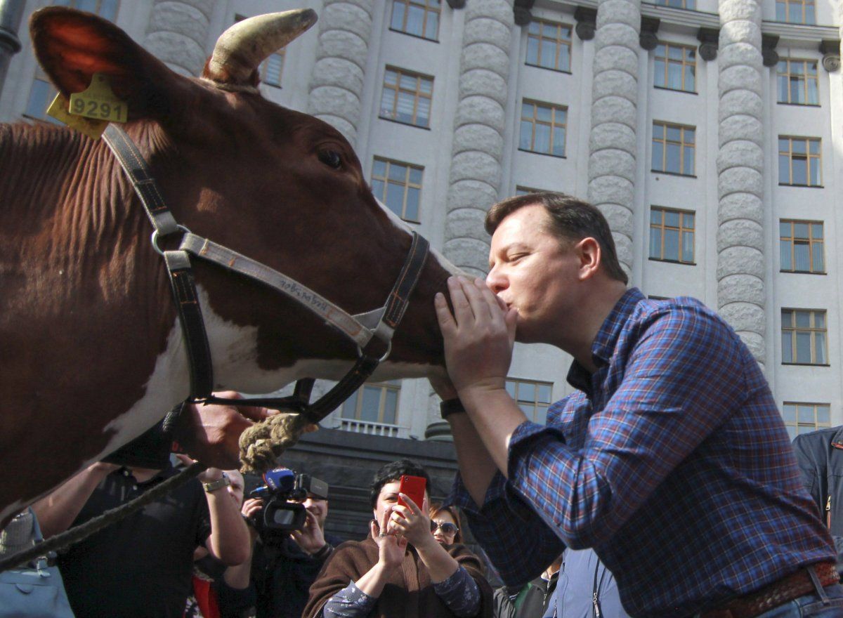 Нардепы и ряд активистов требовали от правительства повышения закупочных цен на молоко. Они пригнали двух коров к зданию правительства. Одну из них Ляшко просто перед камерами поцеловал в нос.