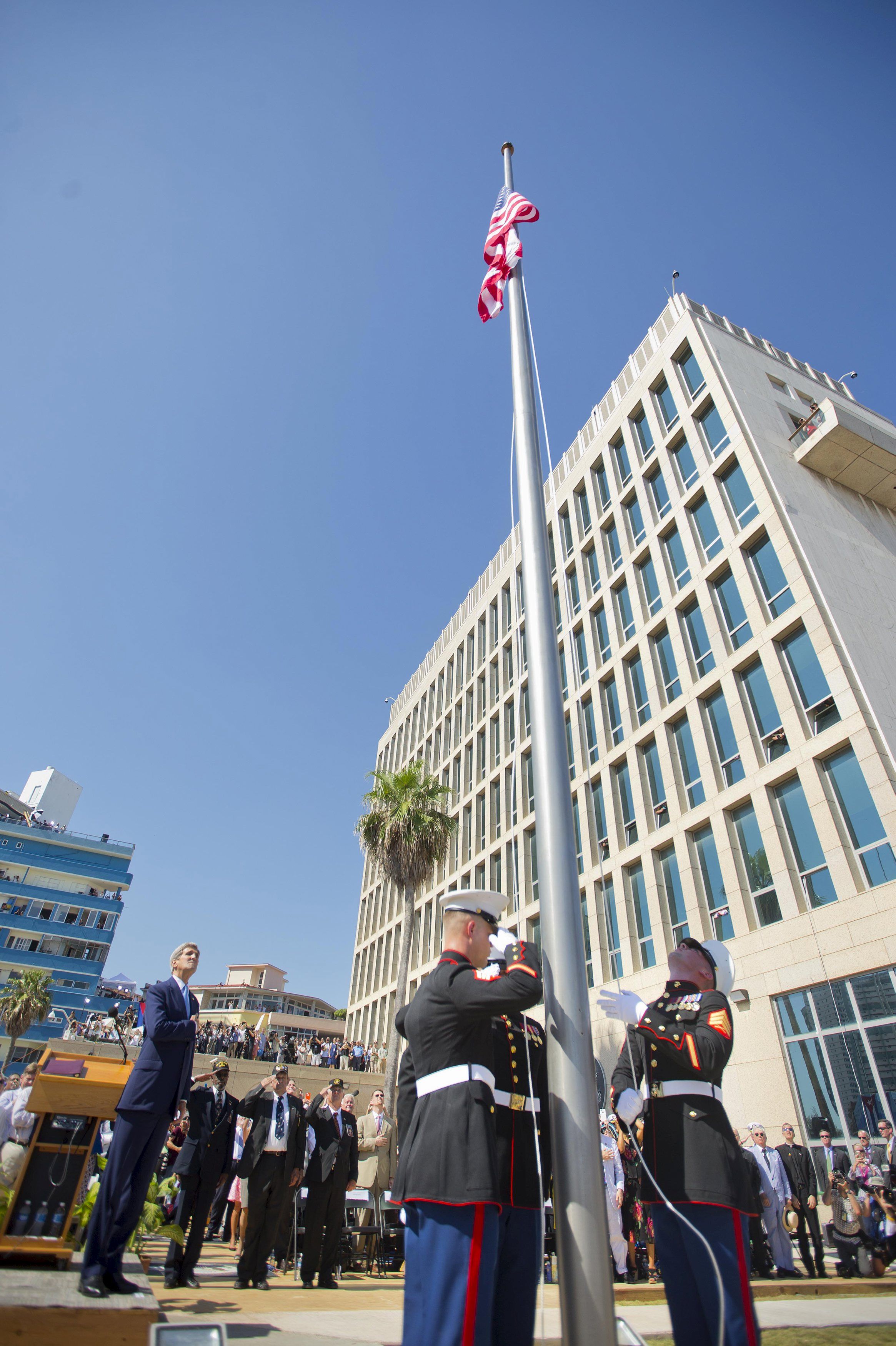 На церемонии присутствовали морские пехотинцы, как это определено дипломатическим протоколом, играл военный сикстет и событие действительно выглядело вековым. К слову, госсекретарь был одним из немногих присутствующих на событии, кто не обмахивался веером и не прятался от солнца - в Гаване сейчас около 33 и сильная влажность. И даже сказал, что чувствует себя, как дома.