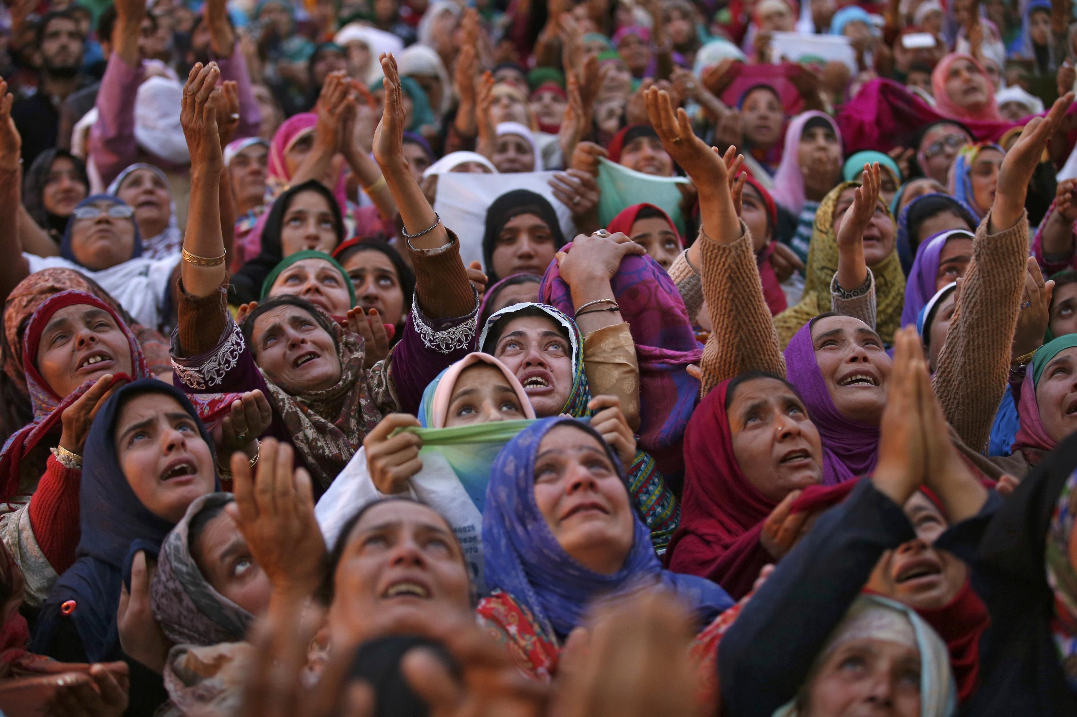 Женщины-мусульманки Кашмира плачут, увидев реликвию, как они считают, волос из бороды пророка Мухаммеда во время торжеств в храме Хазратбал в Сринагаре. / © Reuters