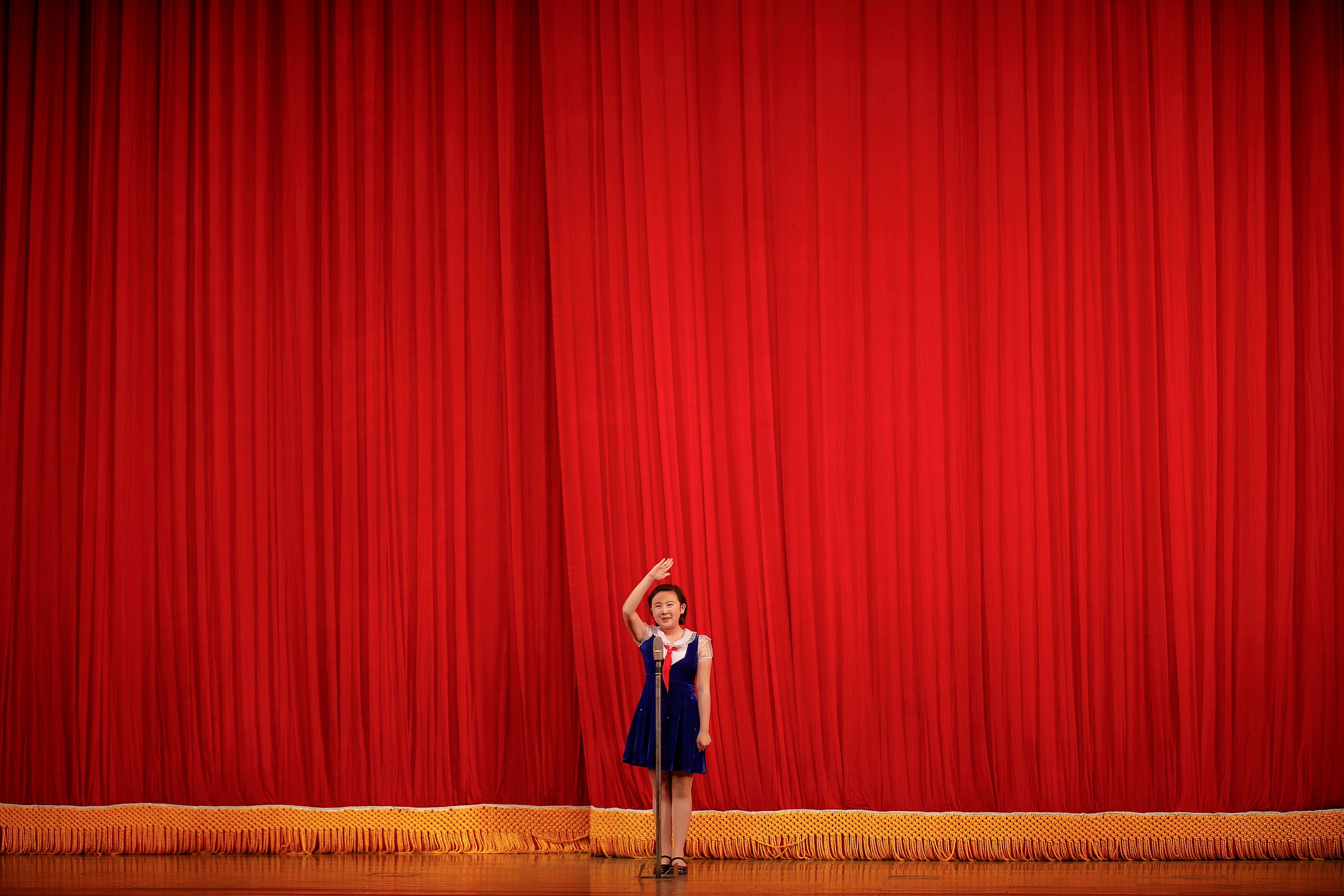 Девочка отдает честь посетителям концерта в детском дворце в центре Пхеньяна, Северная Корея. Местные школьники выступили перед делегациями иностранных журналистов и туристов накануне седьмого съезда Трудовой партии Кореи. / © Reuters