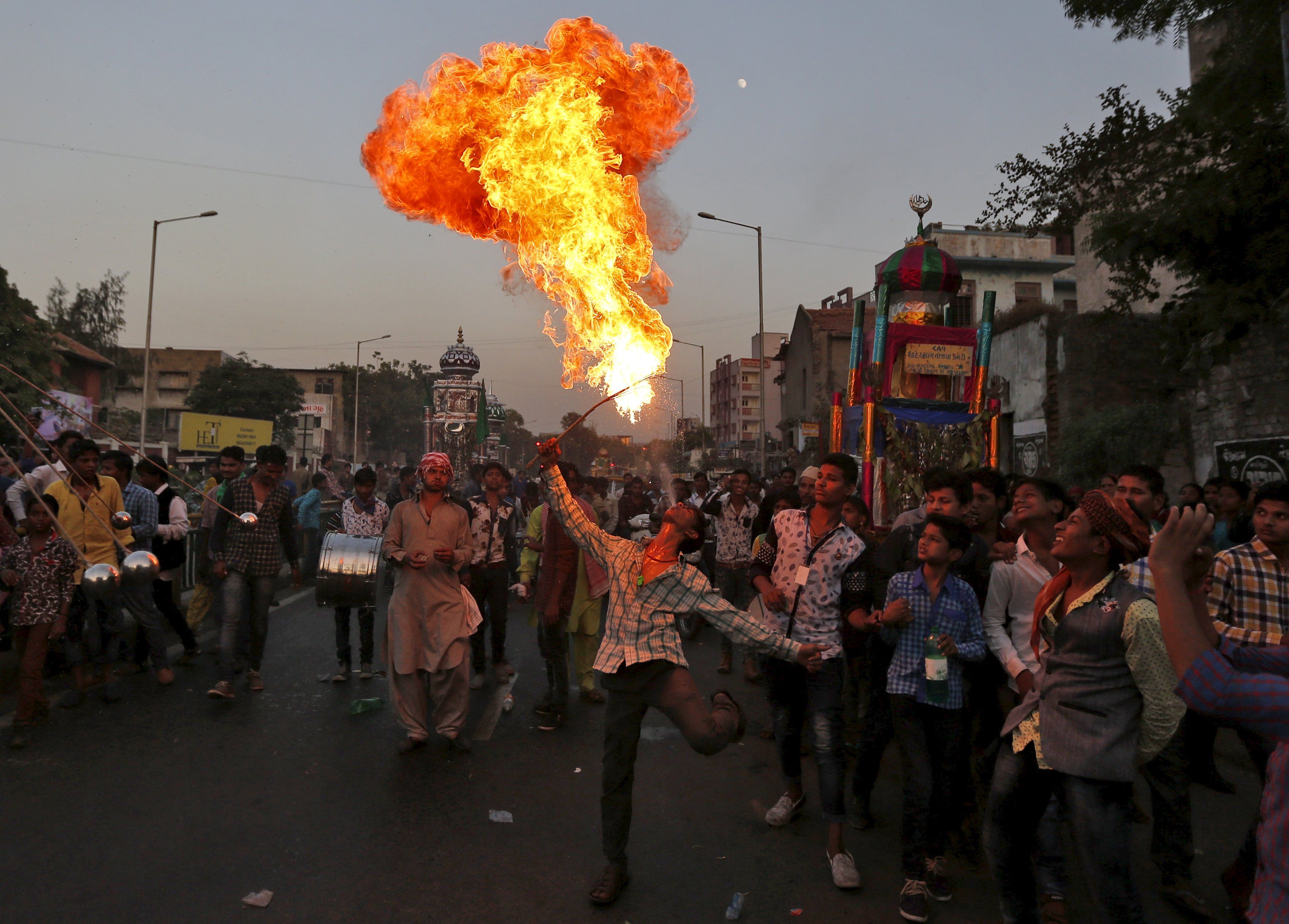 Человек выступает с огнем во время процессии в честь Ашура в Ахмедабаде, Индия. Этот праздник отмечается в память о гибели имама Хусейна, внука пророка Мухаммеда, который был убит в битве при Кербеле в 7 веке. / © Reuters