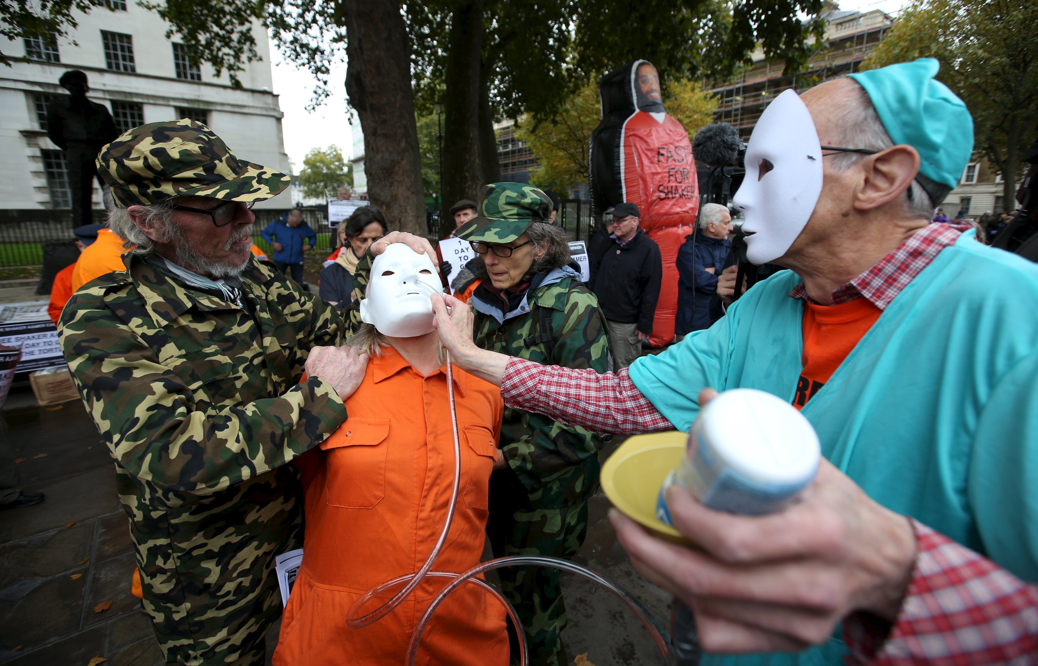 Активисты проводят акцию поддержки Шейкер Аамера, последнего британского заключенного в американской тюрьме Гуантанамо. 46-летний Шейкер Аамер, уроженец Саудовской Аравии и гражданин Великобритании, находится в Гуантанамо более 11 лет без предъявления обвинений. В 2007 году США заявили, что у них нет доказательств причастности заключенного к террористической деятельности. Его жена и трое детей проживают в Лондоне, видеться с Аамером им не разрешается. 24 октября был 5000-й день пребывания Аамера в Гуантанамо. / © Reuters