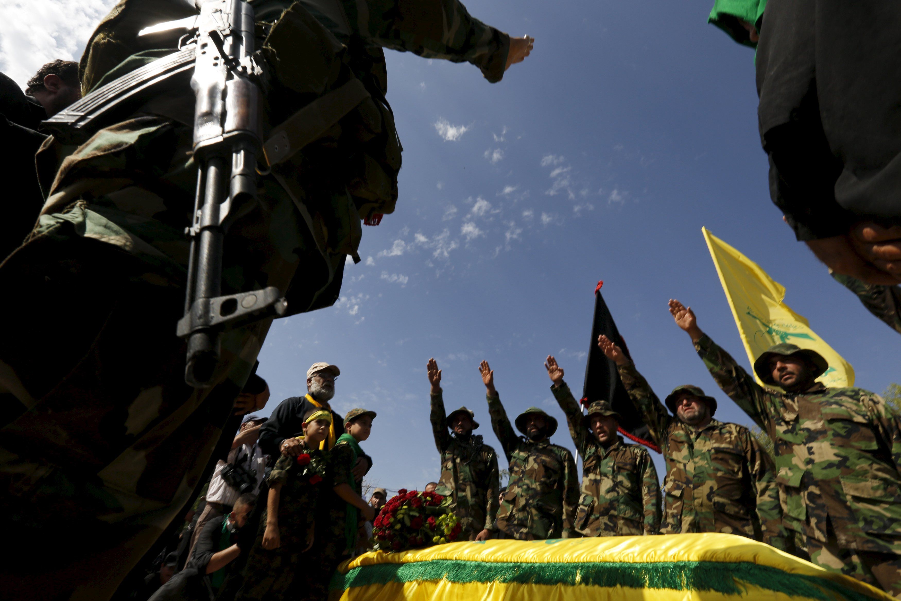 Члены ливанского движения "Хезболла" стоят с поднятыми руками над гробом их сподвижника Аббаса Хамуда во время его похорон в селе Кфар-Кила. Хамуд погиб бою с боевиками сирийской оппозиции в провинции Идлиб. / © Reuters