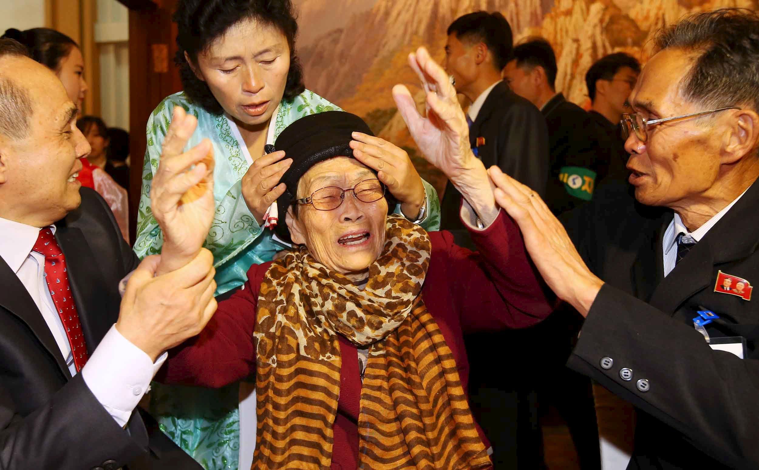 Женщина из Южной Кореи танцует со своим сыном, который живет в КНДР, во время встречи разделенных семей на курорте Кымган, Северная Корея. Почти 400 южнокорейцев пересекли границу, чтобы соединиться с членами своих семей, с которыми они расстались в результате Корейской войны 1950-53 годов. / © Reuters